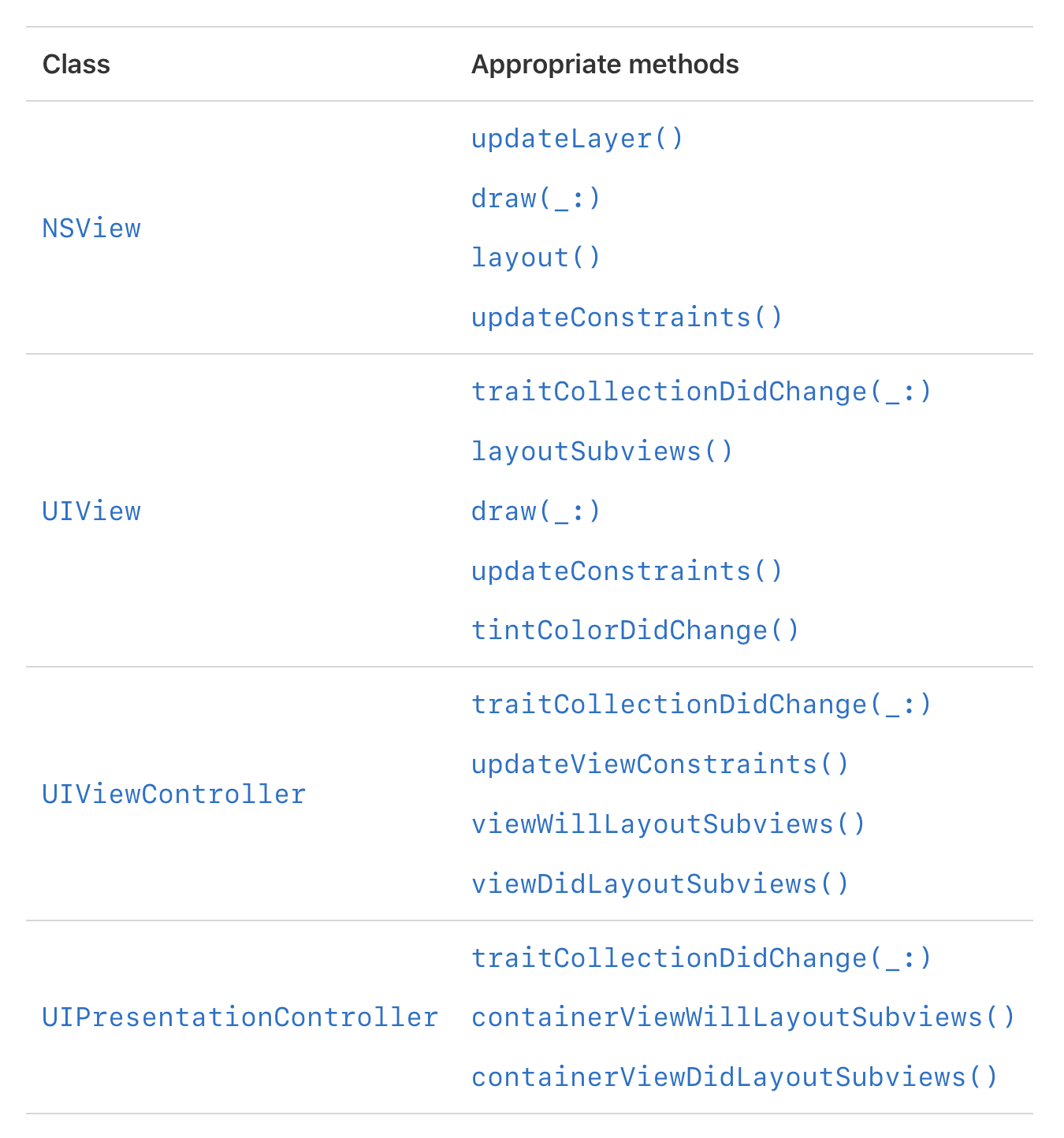 When the user changes the system appearance, the system automatically asks each window and view to redraw itself. During this process, the system calls several well-known methods for both macOS and iOS, listed in the following table, to update your content. The system updates the trait environment before calling these methods, so if you make all of your appearance-sensitive changes in them, your app updates itself correctly.