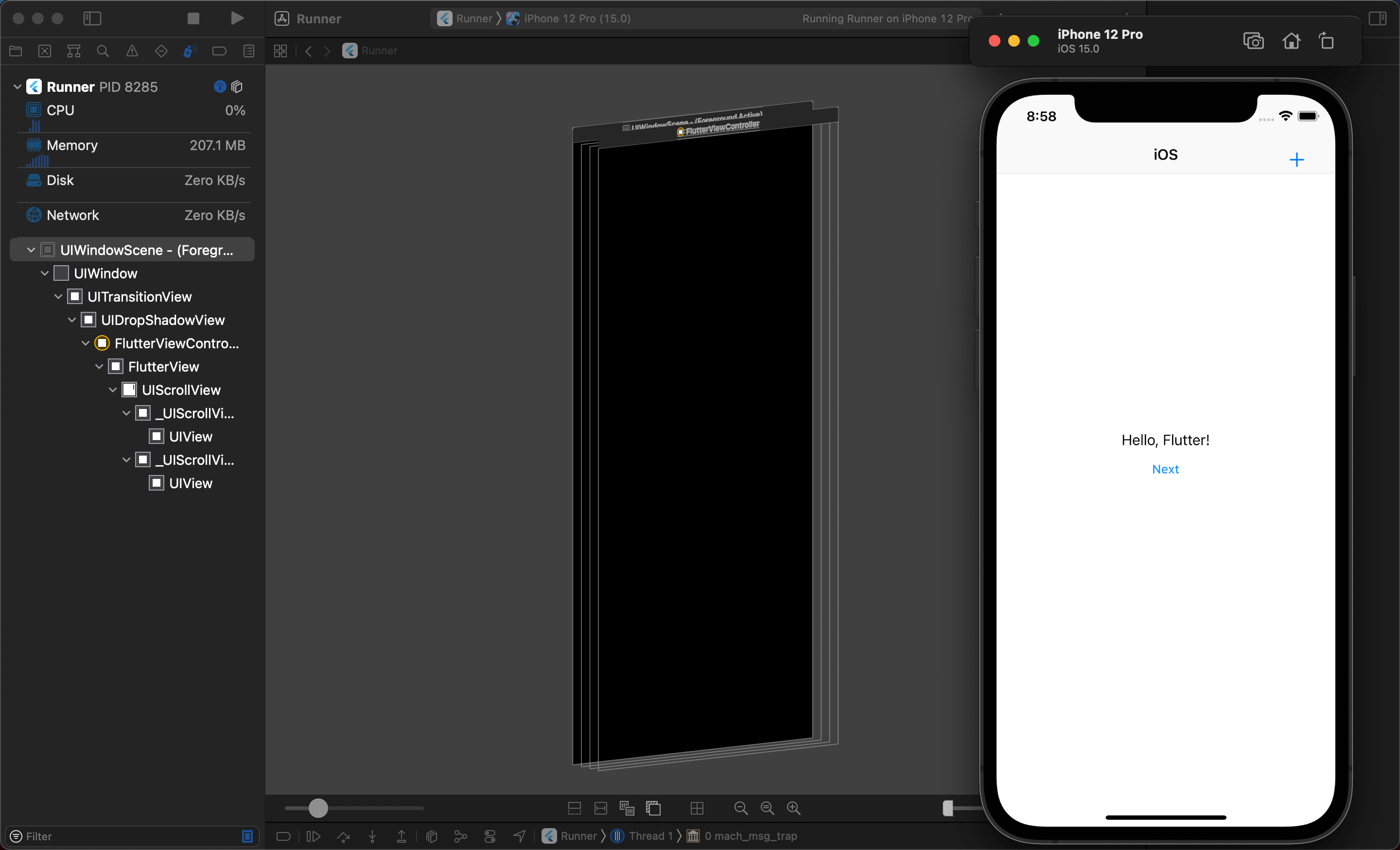 At first, Flutter components confuse me, I think that iOS-like UI elements (CupertinoApp and friends) are back by UIKit, but it isn't. Flutter has its own rendering and runtime engine. If you run a Flutter app in Xcode and open Debug View Hierarchy, this is what you will see.