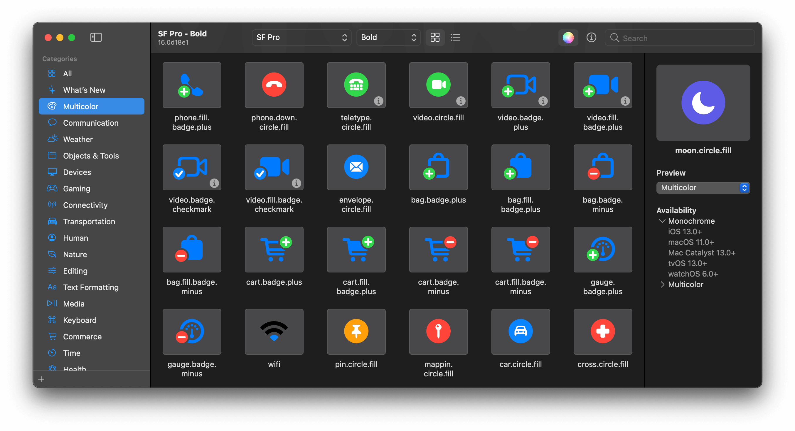 - Select the "Multicolor" category on the left panel, which will filter all multicolor supported symbols. Everything not in this list is the first type, Monochrome only.