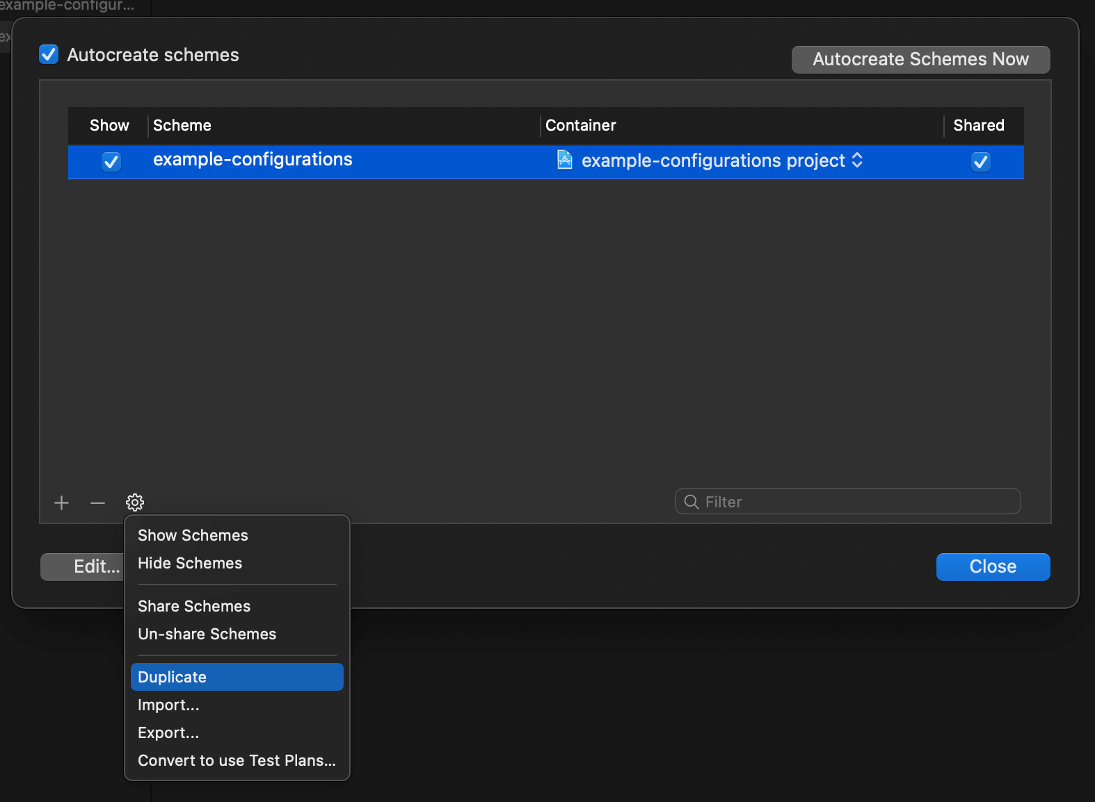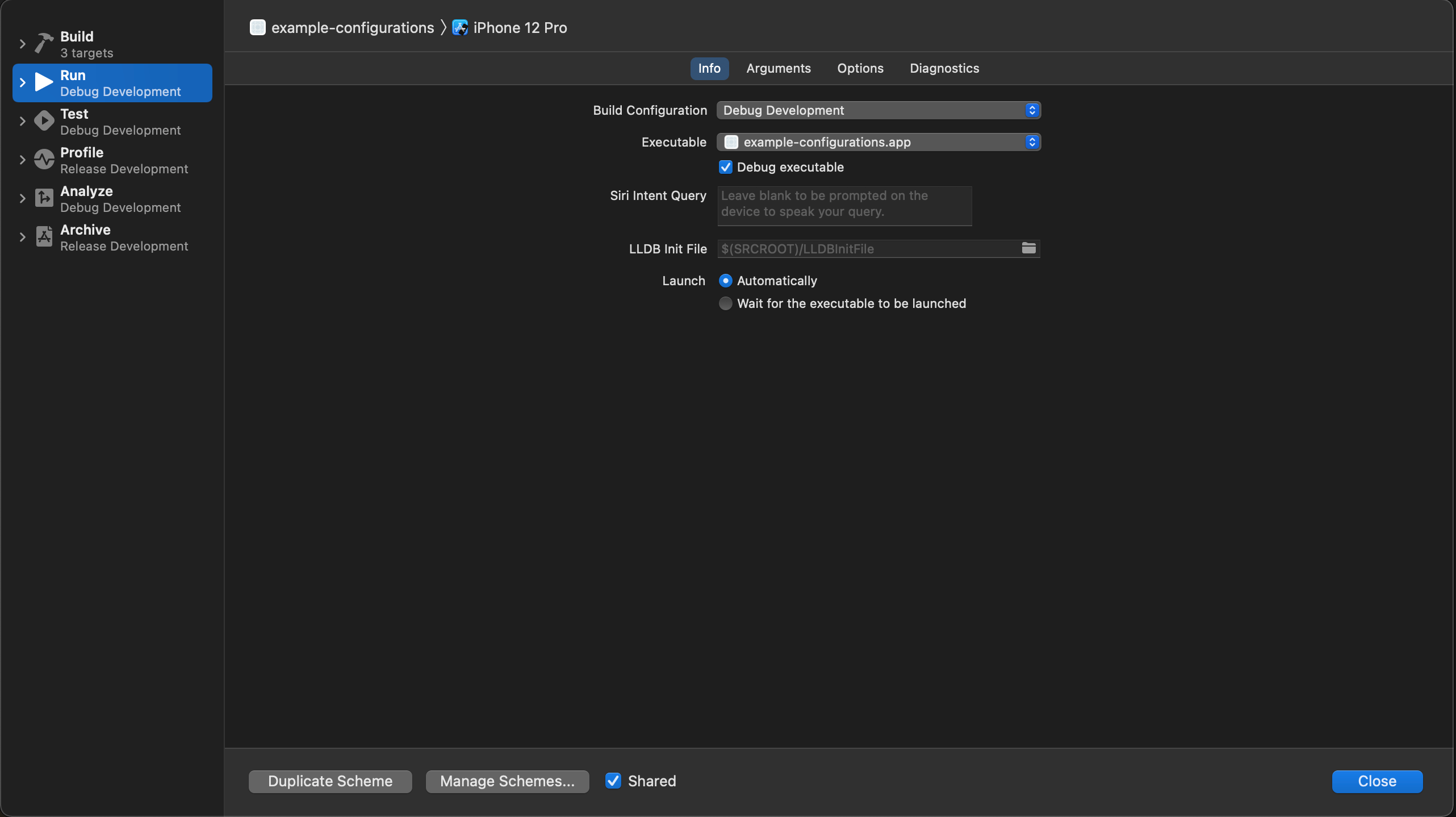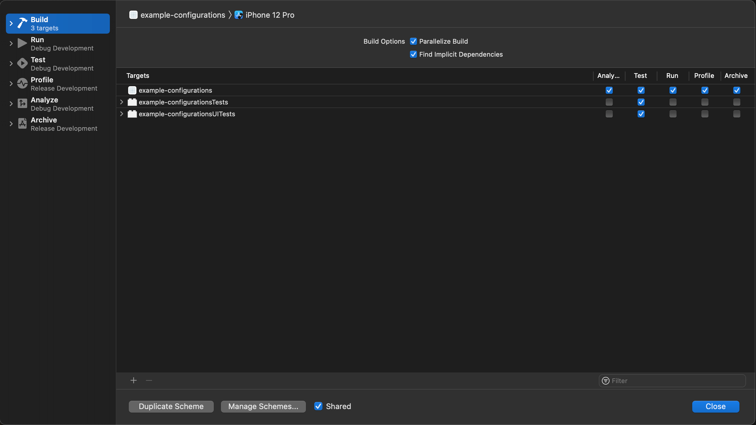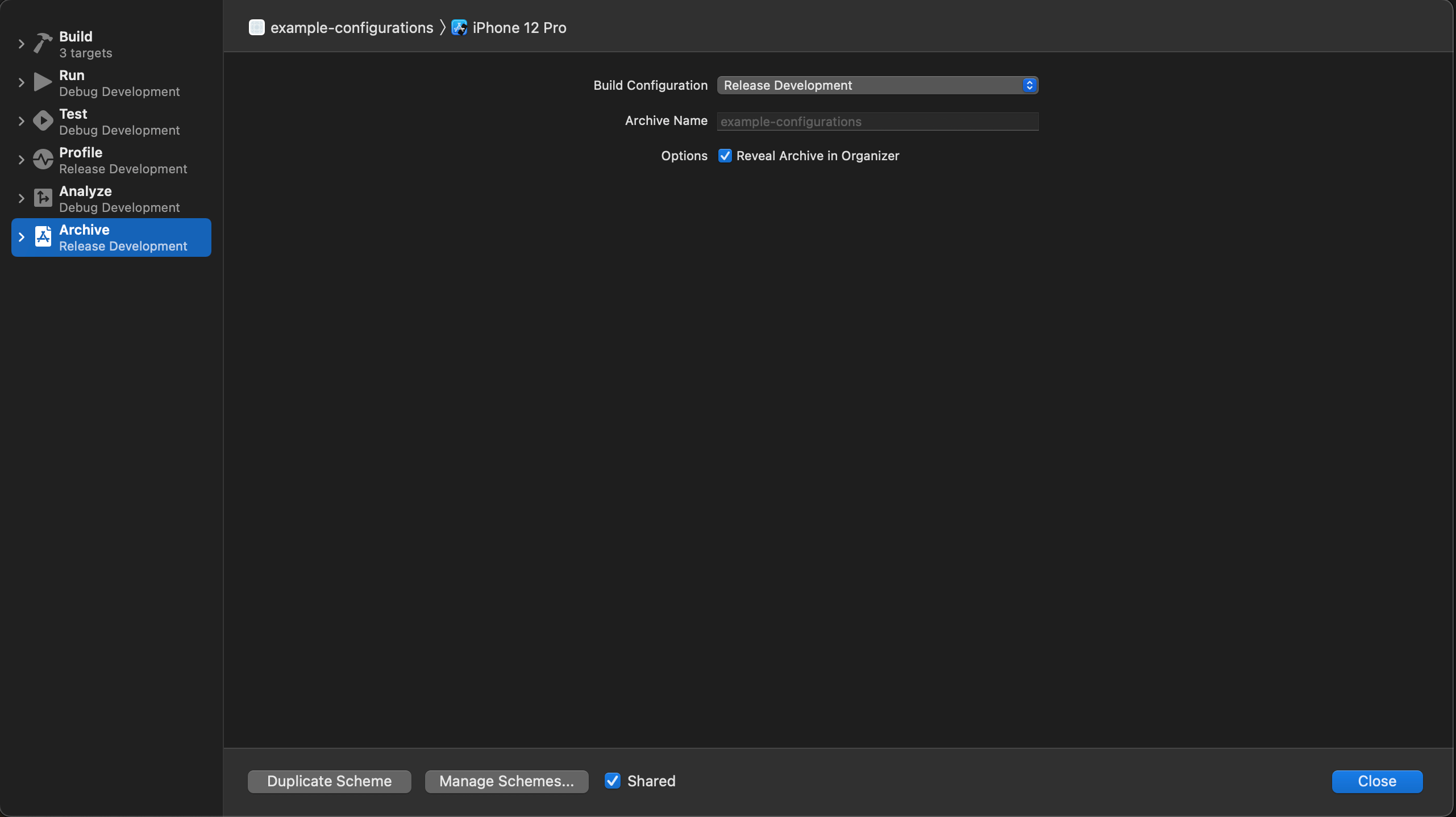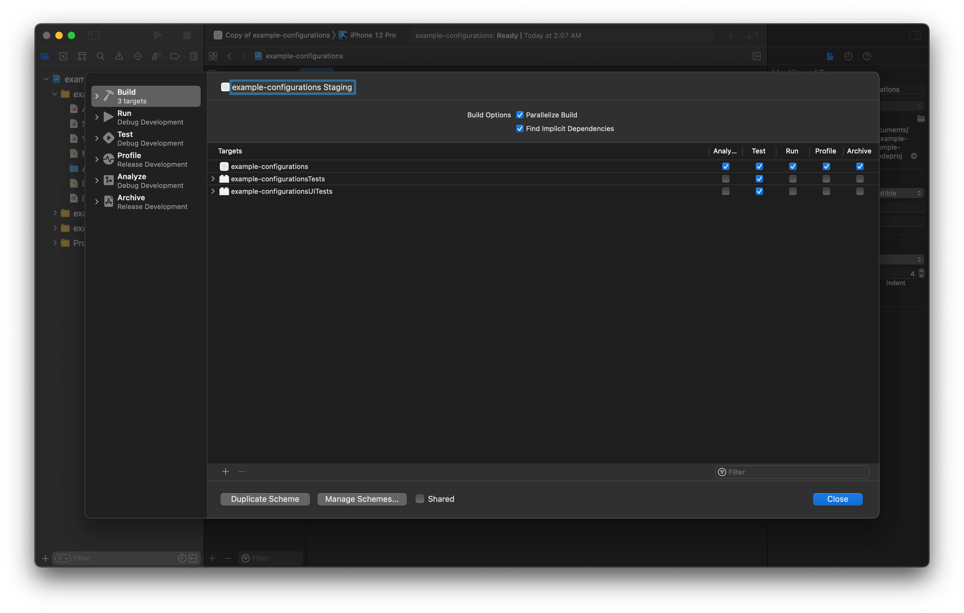 Every new Xcode project comes with one default scheme. The easiest way to create a new scheme for our environment is to duplicate the default one and change the build configuration.