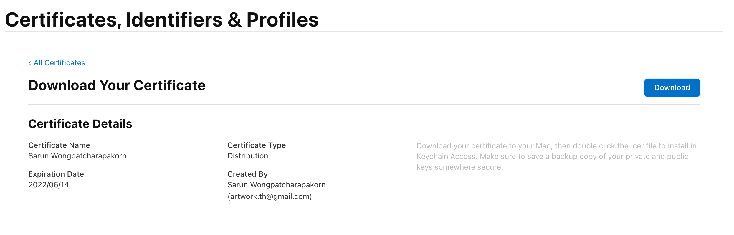 cerfile to install it in Keychain Access. The keychain app should open up automatically, and you will see your certificate under My Certificates tap. You can identify your certificate by name. It will show in this formatTYPE_OF_CERTIFICATE FIRSTNAME LASTNAME (TEAM_ID). If you expand it, you will find a key with the same name that you just created in Create a certificate signing request.