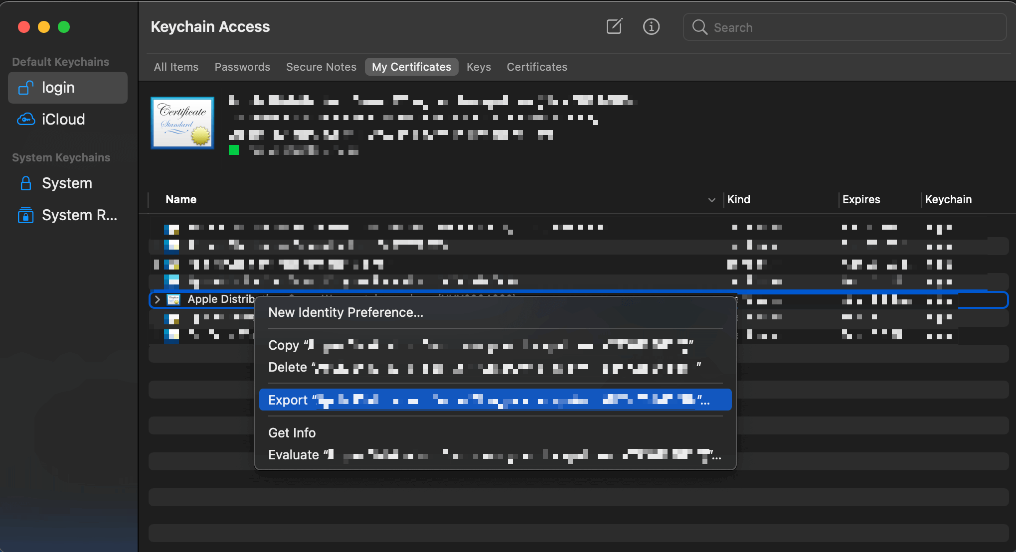 TYPE_OF_CERTIFICATE FIRSTNAME LASTNAME (TEAM_ID), e.g., Apple Distribution: Sarun Wongpatcharapakorn (XYZ). - Right-click and select Export.
