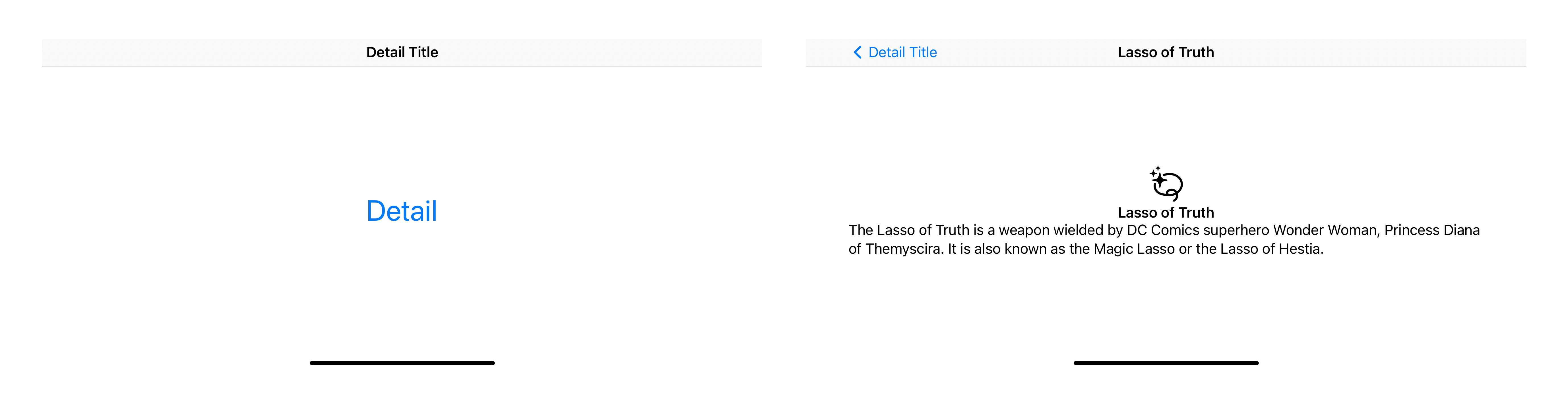 You can see that once we navigate to the destination view, the navigation view pickup .navigationTitle("Lasso of Truth") from the destination and show up on the navigation top bar.